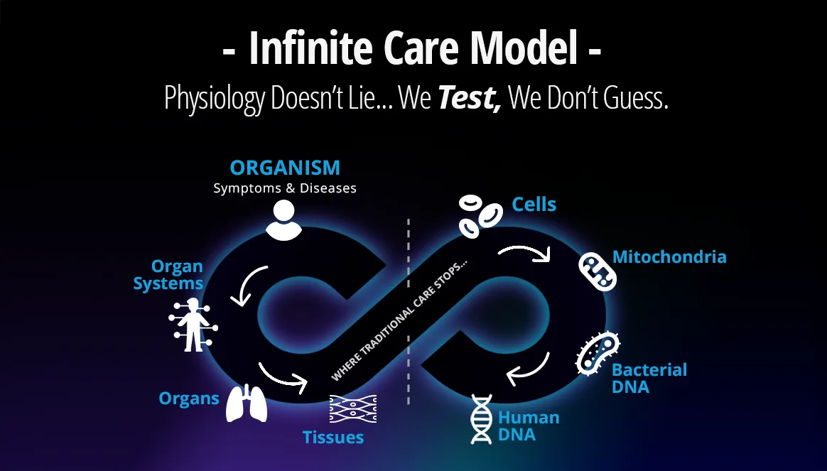 The Infinite Care Model shows how health is a continuous system, not a set of disconnected parts. Symptoms appear within the organism (you), which is made up of organ systems, built from organs, which are formed from tissues. This is where traditional care often stops—right before or at the cellular level.