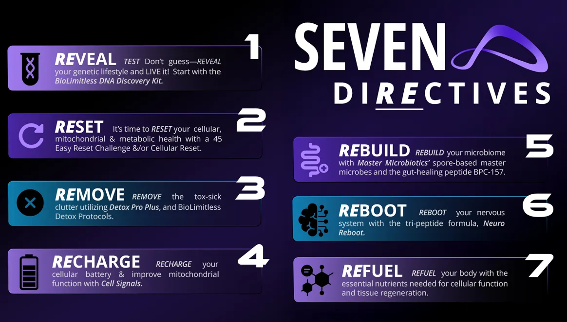 The Seven Directives are action steps: clear, targeted priorities that guide you beyond symptom management to root-cause health. Each directive is paired with a BioLimitless solution so you can take action immediately: