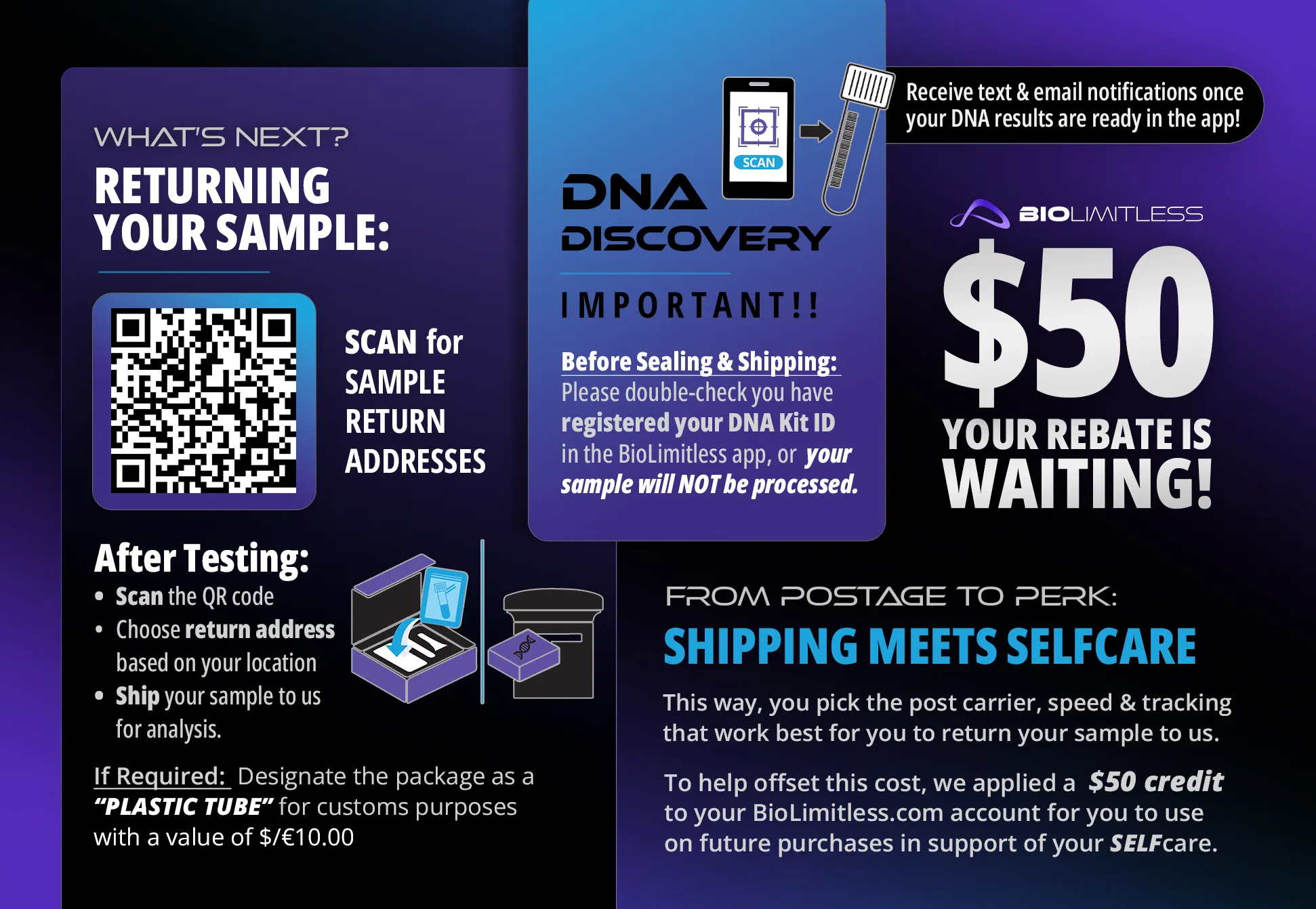 Unlike ancestry or novelty kits, this is built for better decisions: eat smarter, train wiser, recover better, and plan long-term with confidence—based on your unique genetic tendencies. Your data stays secure, and your genetic-driven selfcare data will always be available right at your fingertips.* *DNA sample return shipping is paid by you, the customer. A $50 account credit is automatically applied at checkout and may be used toward future purchases to help offset return shipping costs.*